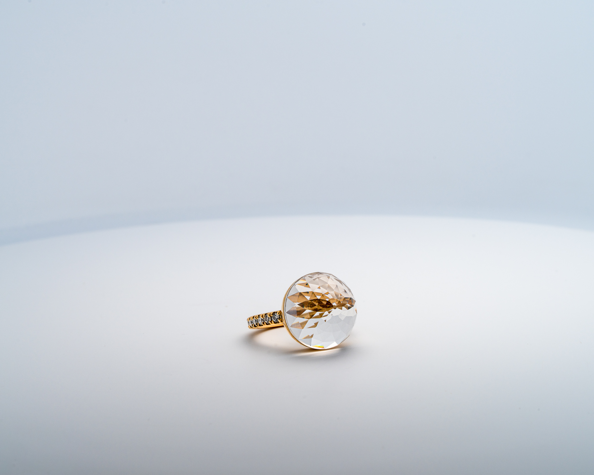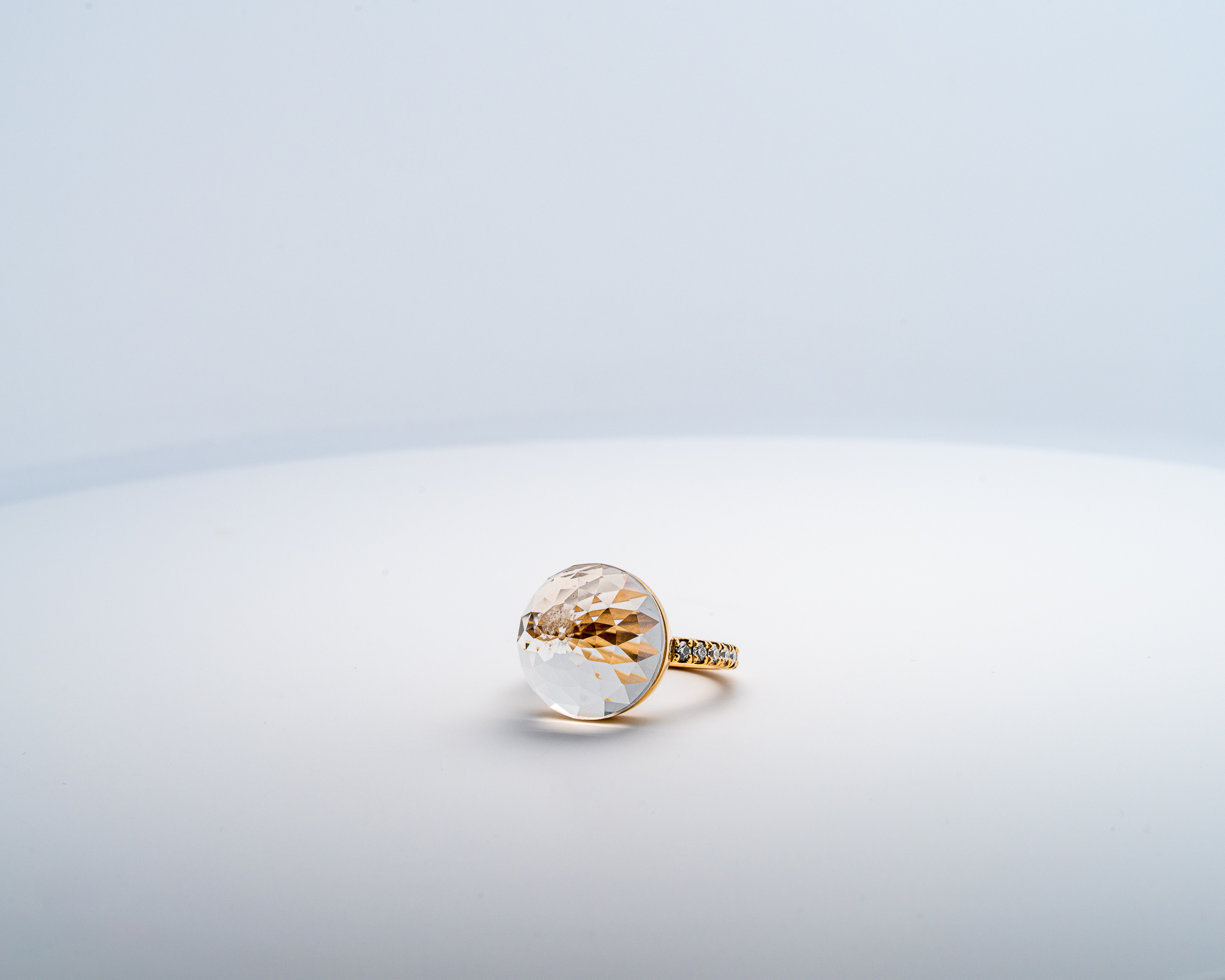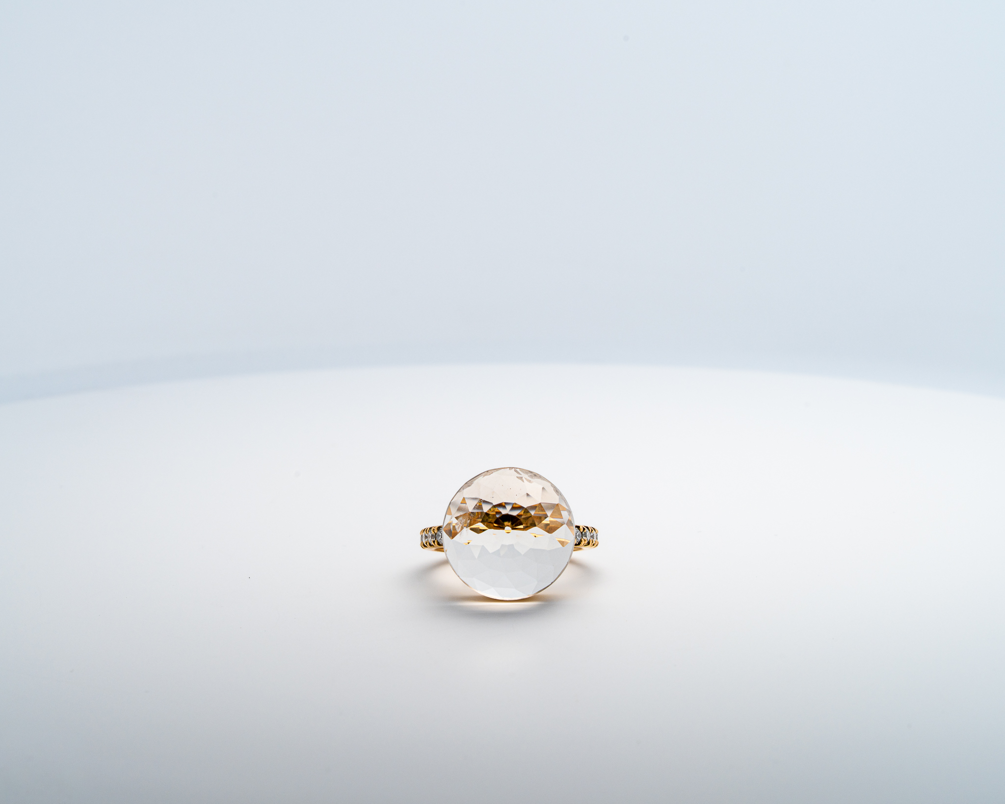 La bague Asteria en or jaune, sertie d’un quartz taillé en 200 facettes et pavée de diamants, est une pièce de joaillerie classique et éclatante. Voici une description détaillée de cette bague :