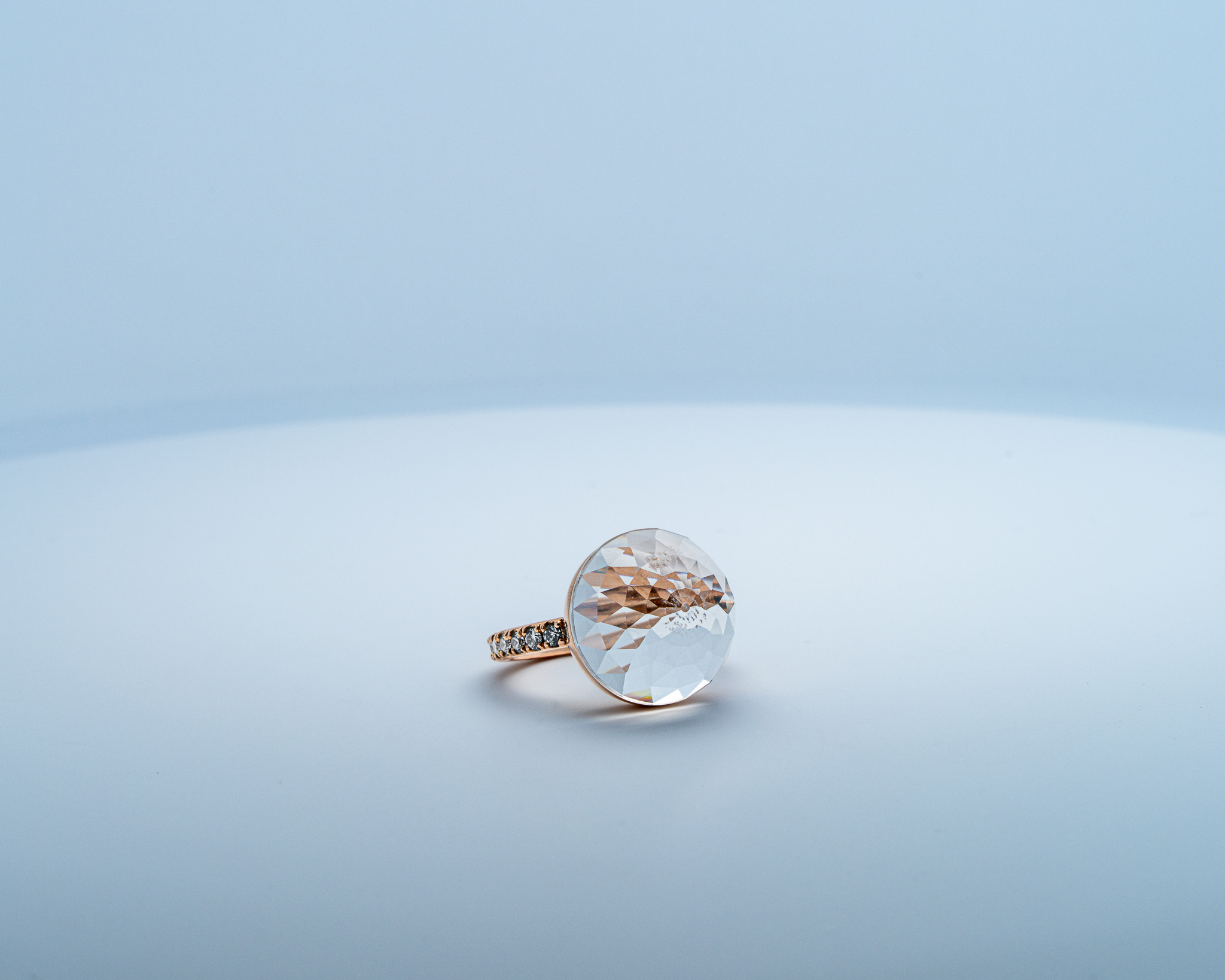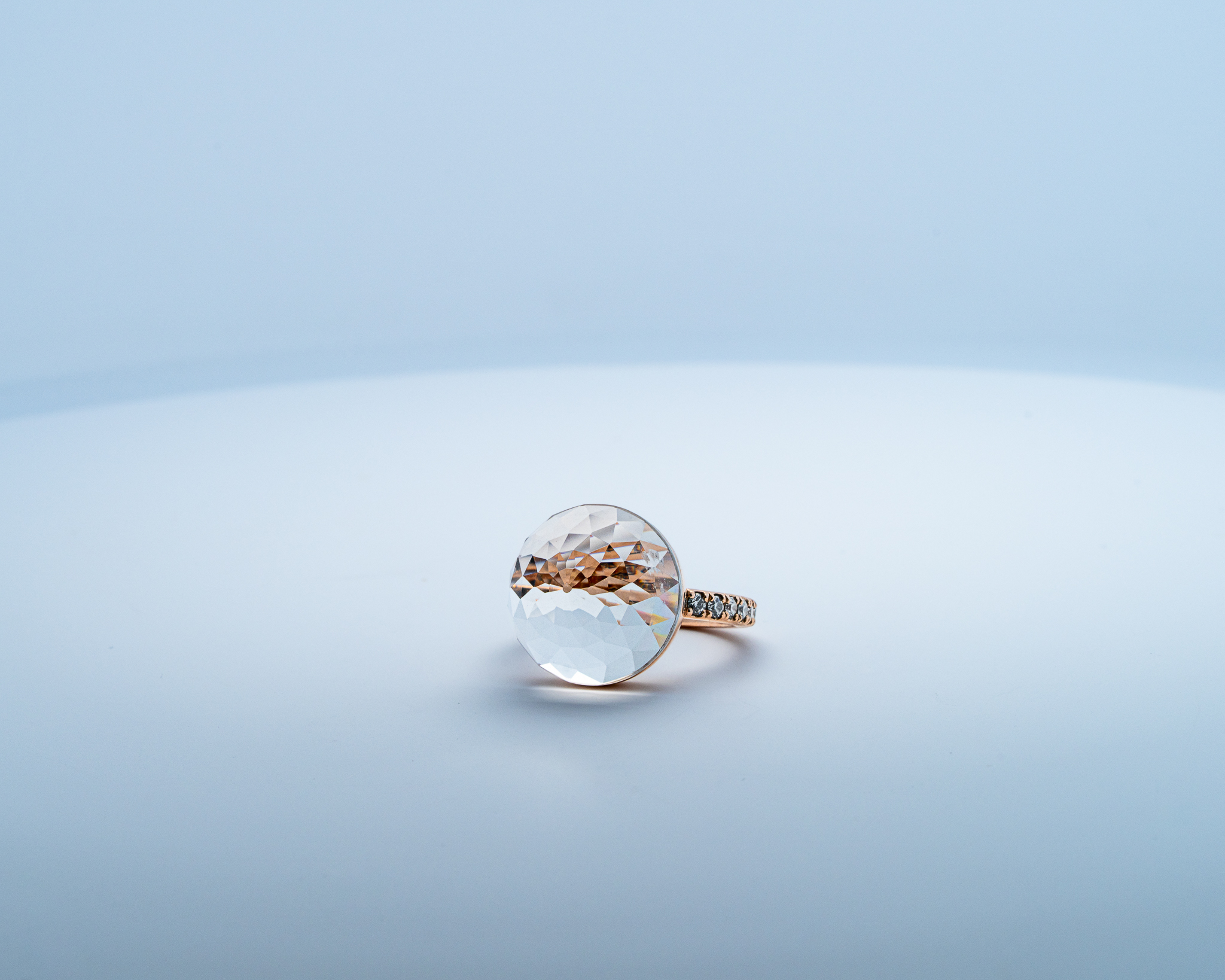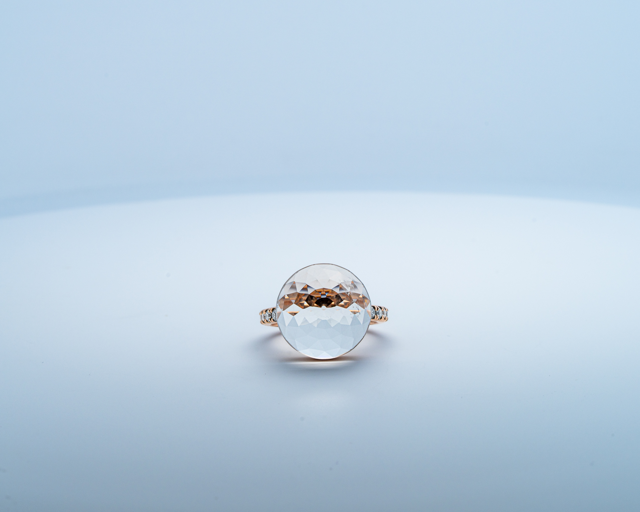 - Pavage de diamants : L’anneau est subtilement pavé de petits diamants étincelants, qui entourent le quartz ou longent l’anneau, ajoutant un éclat supplémentaire. Les diamants accentuent la brillance naturelle du quartz et de l’or rose, apportant une touche de luxe et de glamour. Le pavage de diamants crée un jeu de lumière délicat qui met en valeur la pureté du quartz tout en ajoutant de la profondeur et du raffinement à la bague.